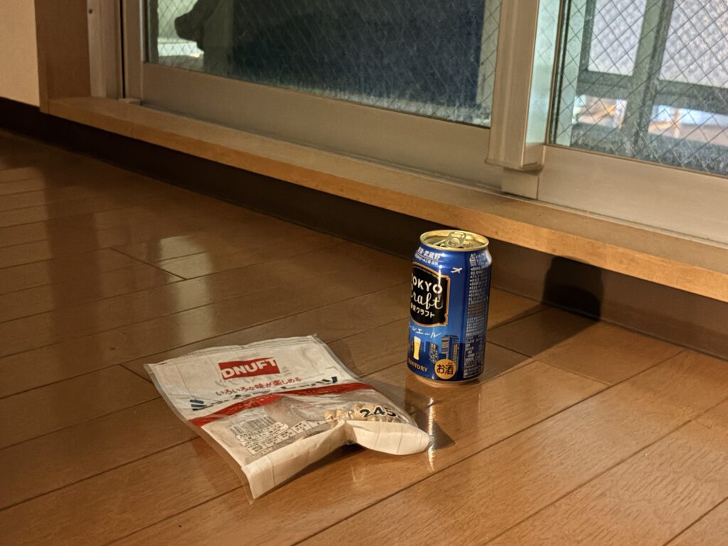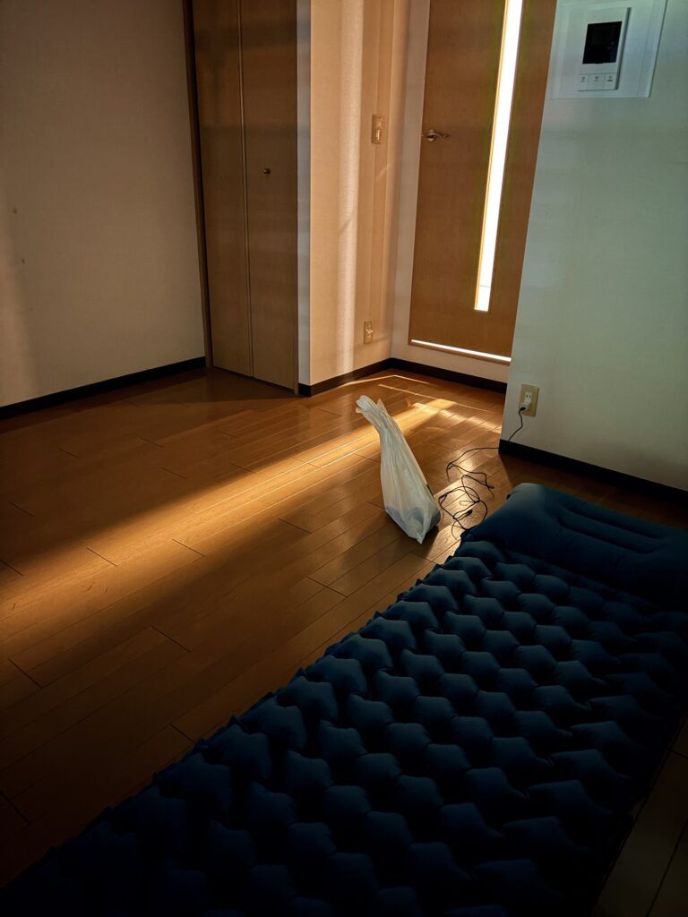 夜遅くなるかもしれない予定だったので、飛行機は明日予約しており、今日は何もない、照明もないところで、寝袋で寝る。